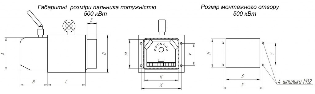 Габаритні і монтажні розміри пелетного пальника 500 кВт: